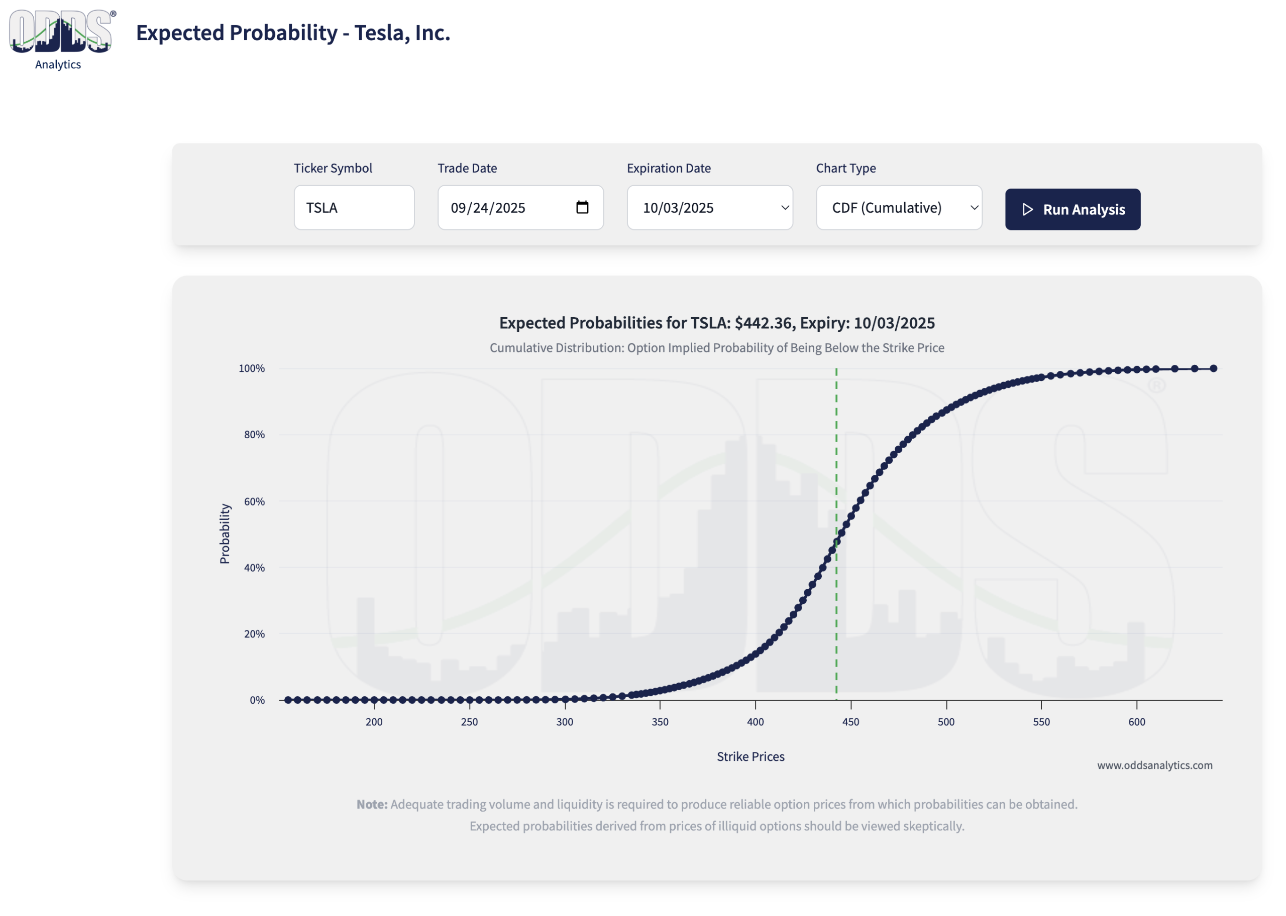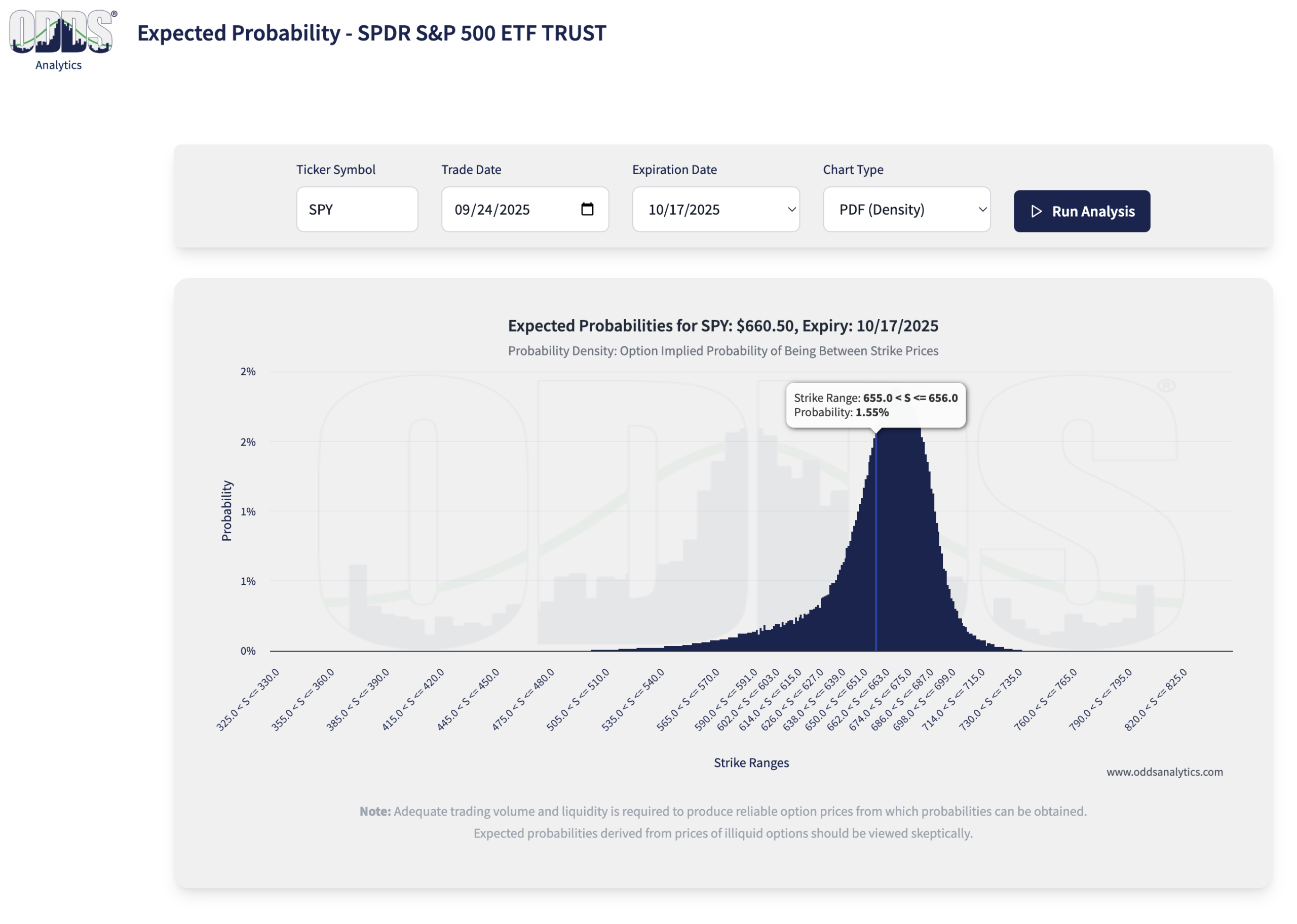 Just as anyone can look at the odds in Vegas and infer expected probability, ODDS EXP uses a similar approach to create Probability Distributions for stocks, indexes and ETFs. We convert observed option prices into expected probabilities that the stock will lie within a specific price range at a certain time.